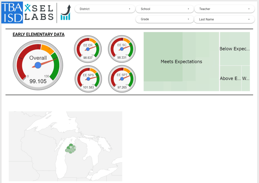It’s not just happening in Wisconsin. The team at Traverse Bay Area Intermediate District in Northern Michigan is using SELweb to engage district leaders in deep discussion about student social and emotional strengths and needs. They are helping educators in their districts tie what they learn from the assessment data to competencies described in the Michigan standards, and to use what they learn to develop specific action plans. They even imported the data into their own data management system and created a dashboard to meet their needs: