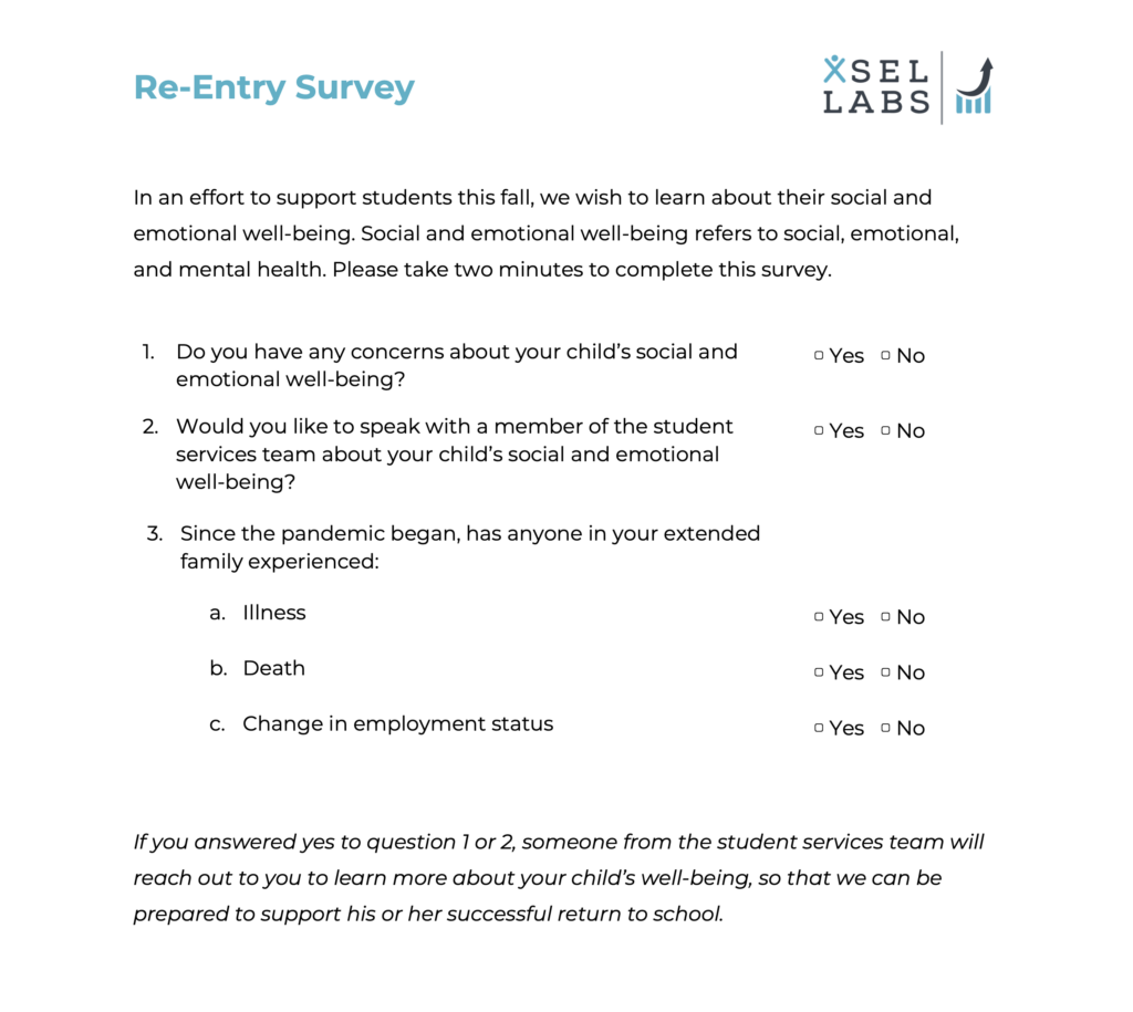 Specifically, a simple and informative method is to ask all parents whether (1) they have any concerns about their children’s social and emotional wellbeing or mental health or (2) if they would like to speak with a member of the student services team to discuss their student’s social and emotional well-being. If the answer to either of these questions is “yes,” a qualified member of the team should reach out to the parent to learn more and conduct more assessment as needed.